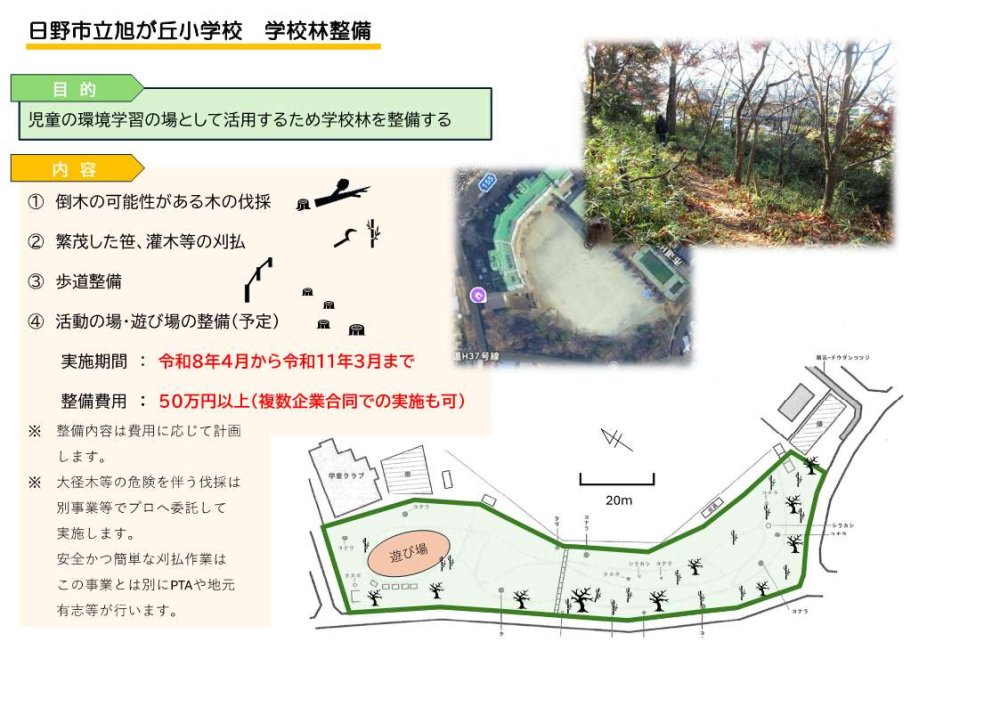 第2号案件として、「日野市立旭が丘小学校 学校林整備」の募集を開始しました。