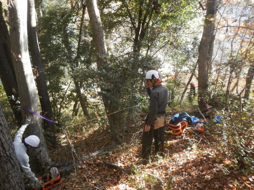 アラカシは、チルホールを使って牽引しながら、安全に伐倒しました。