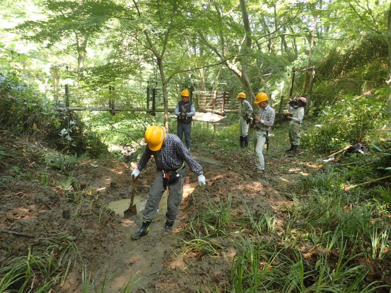 東大和市立狭山緑地の保全・整備・活用事業。 刈払機による下刈りやチェンソーによる伐倒、薪割り機による薪割り等を行いました。その他、園路・水路の整備、園路柵整備、竹林整備、巣箱調査と掛け替えや、炭作りを実施しました。
