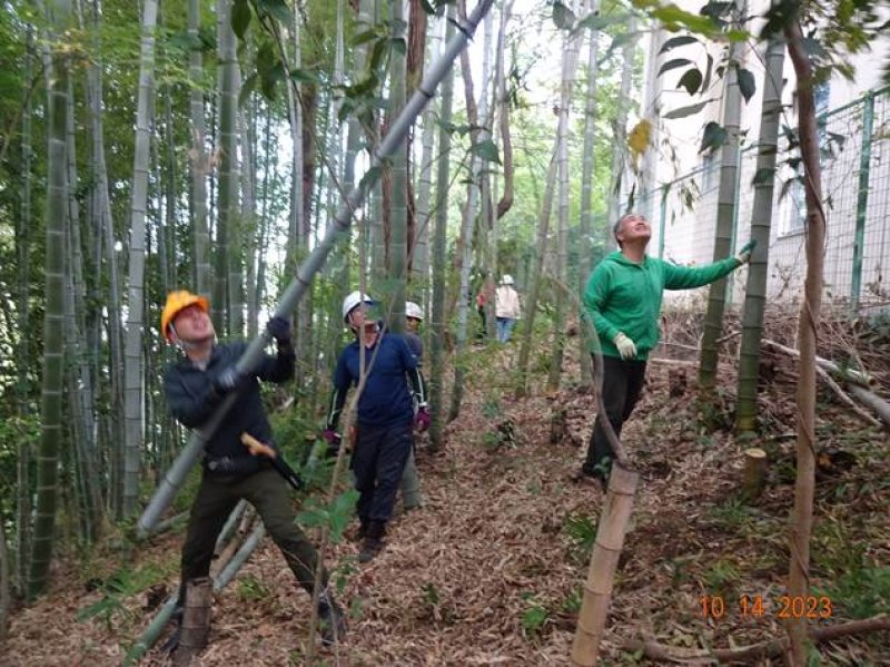 【宇津木の森 再生プロジェクト】 八王子市の宇津木の森で、里山の保全や地域交流、自然体験活動を行いました。 春~夏は、冬に伐採した木の薪割りや粉砕処理、ホダ木本伏せ。草刈りを実施しました。 秋~冬は、雑木林の萌芽更新、落葉かき、腐葉土づくりなどを行いました。伐採した木は、薪や炭、キノコのホダ木に活用したり、チップにし処理しました。 雪で倒れた竹を伐採し、新たなバイオネストを作成。 定例活動では作業の他、タケノコ堀りや梅もぎ、栗拾いなど森の恵みを楽しみました。